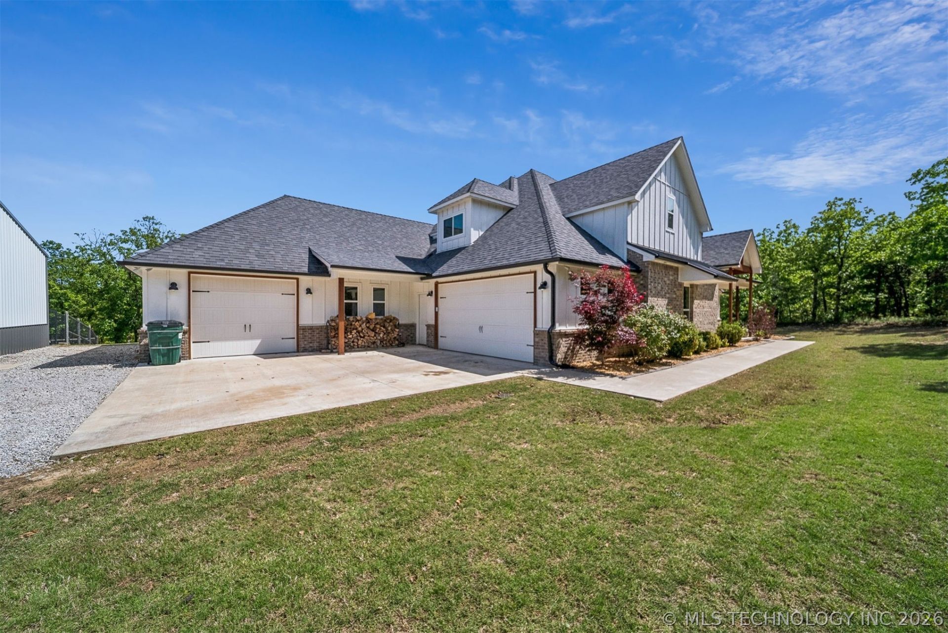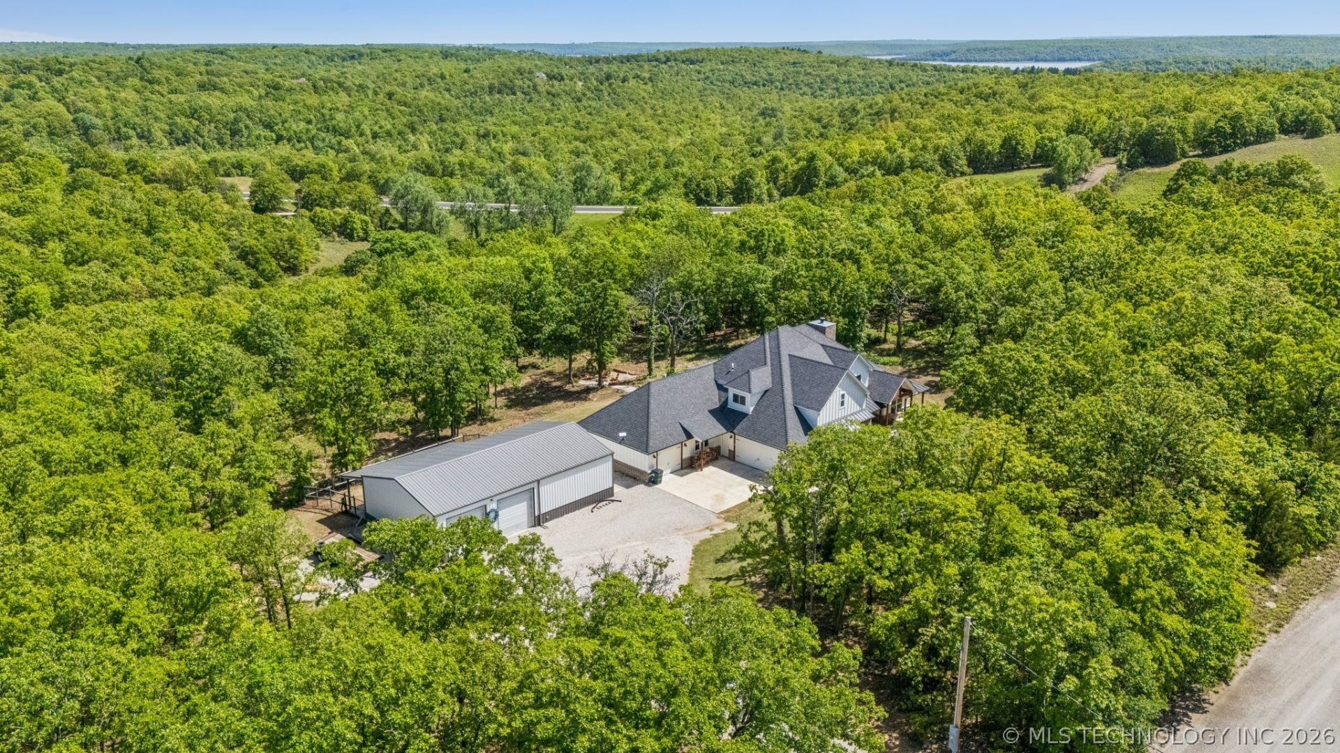 Custom built in 2020, this exceptional property sits on 18.68 acres of beautiful, wooded land and offers the perfect blend of privacy, functionality, and high-end finishes. The home features 4 bedrooms, 3.5 bathrooms, plus a dedicated office that could serve as a fifth bedroom. The open-concept living and kitchen area showcases vaulted ceilings with exposed beams, wood flooring throughout, quartz countertops, stainless steel appliances, and an oversized pantry with butcher block counters. Built with efficiency and durability in mind, the home includes full foam insulation, two tankless water heaters, and a Class 4 impact-resistant roof. Enjoy surround sound throughout the living room, kitchen, primary suite, primary bath, home gym, and back porch. Additional features include an oversized 2-car garage with a concrete reinforced safe room, a dog wash in utility room, and a mini-split HVAC unit in the single-car garage currently used as a home gym. The property also includes a 30x50 shop with lean-to and 200 amp service, offering ample space for equipment, storage, or hobbies. Outdoor living is highlighted by a brick firepit and scenic acreage providing endless possibilities. This is a rare opportunity to own a thoughtfully designed home with land, privacy, and premium upgrades throughout.